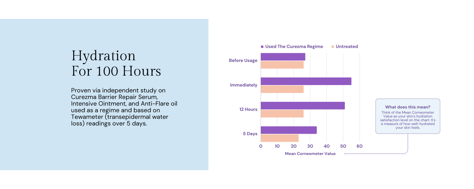 *Based on clinical trials using instrumentation study ( Corneometer ,Tewameter & Chromameter) and self-perception questionnaire (SPQ) when used Curezma product regime